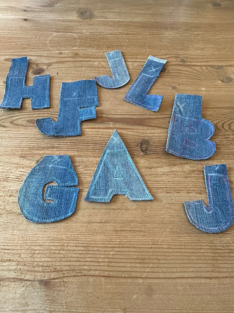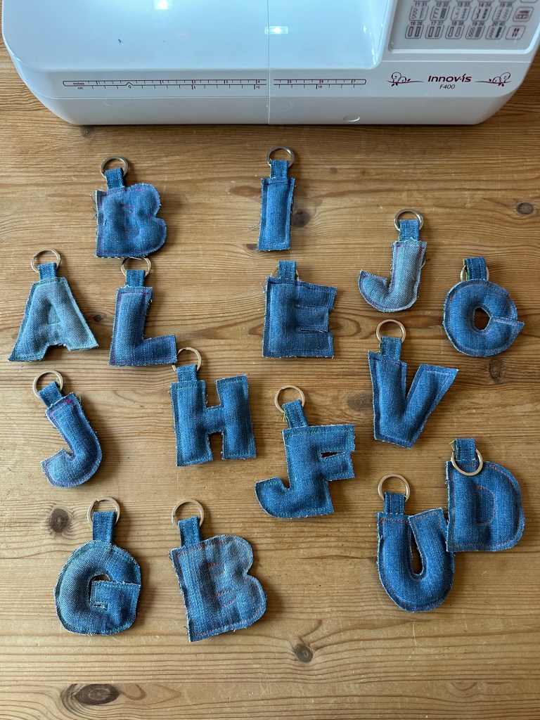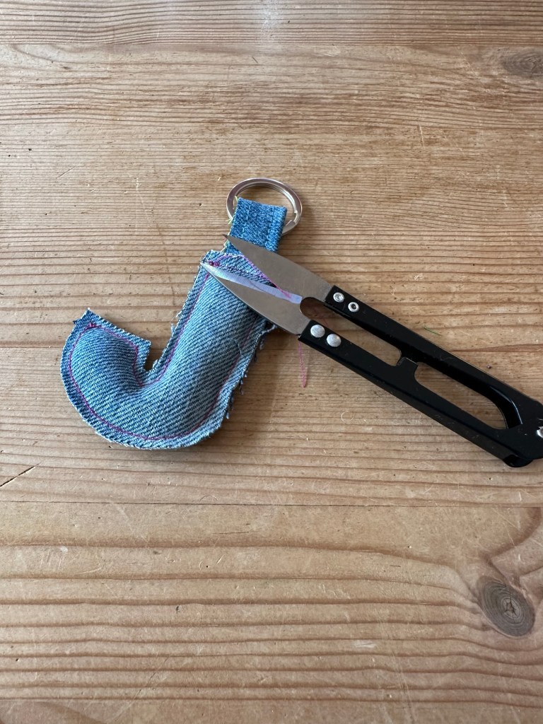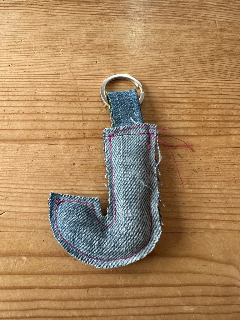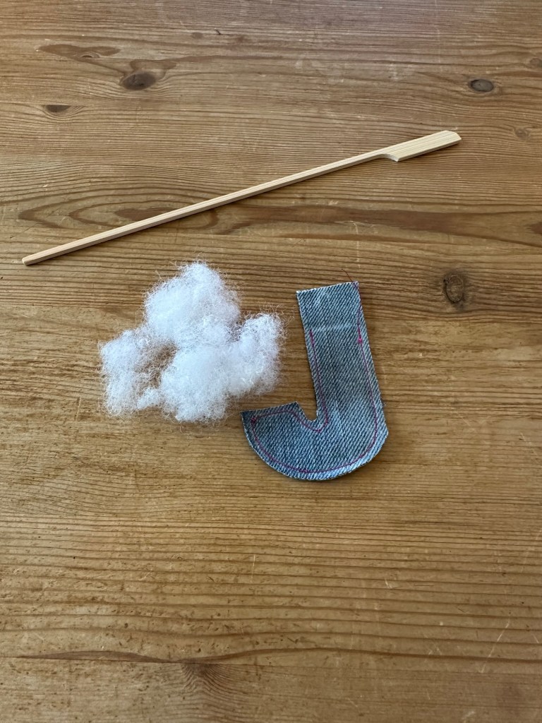 Nun stopfst Du den Buchstaben mit dem Füllmaterial aus, steckst den Anhängerstreifen in die Öffnung und nähst ihn fest.