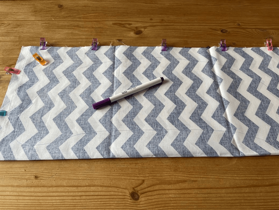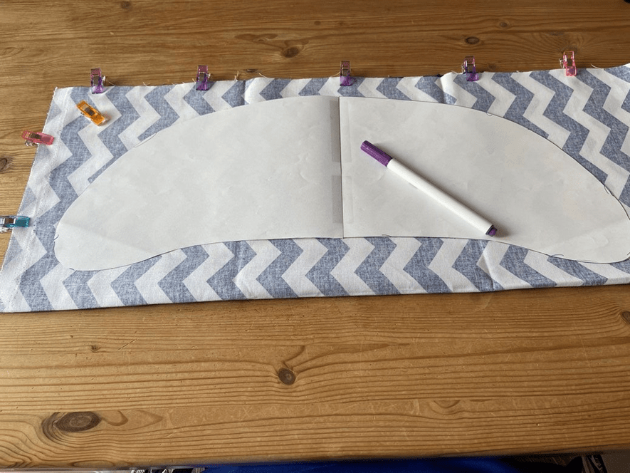 Nehmt Euren Stoff doppelt, indem ihr ihn rechts auf rechts legt. Fixiert ihn mit Nadeln oder Klammern, damit nichts verrutschen kann. Zeichnet Euch nun die Vorlage auf den Stoff.