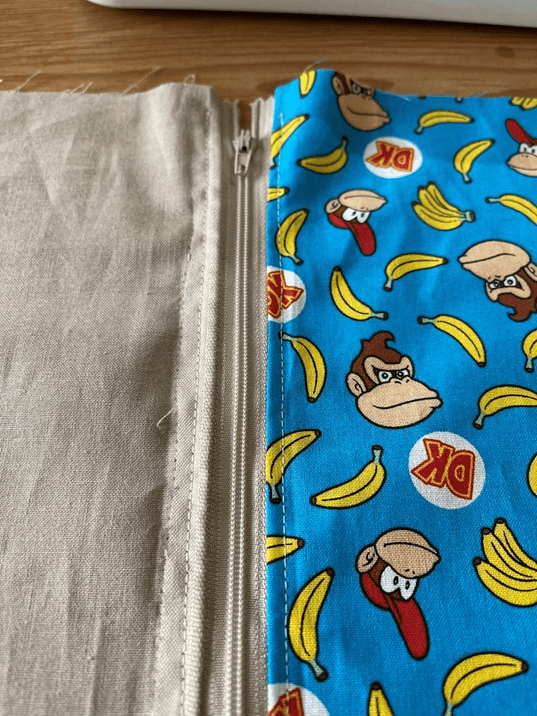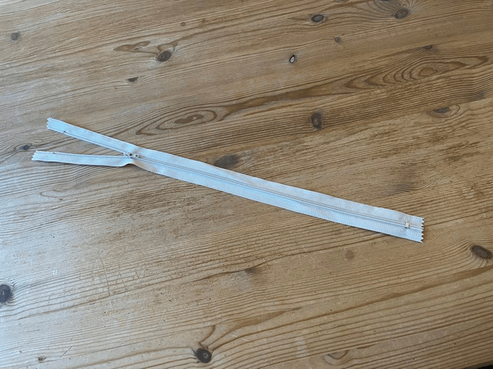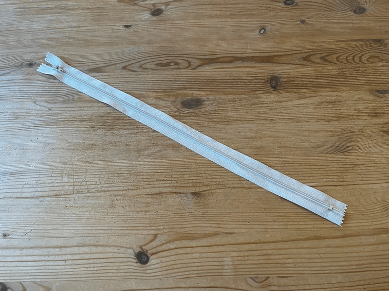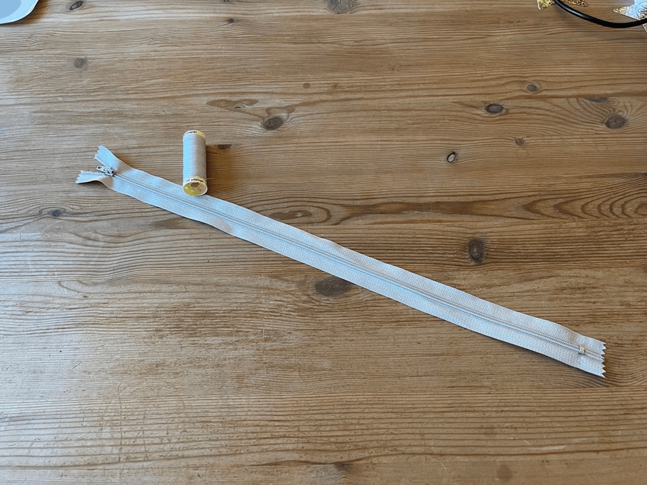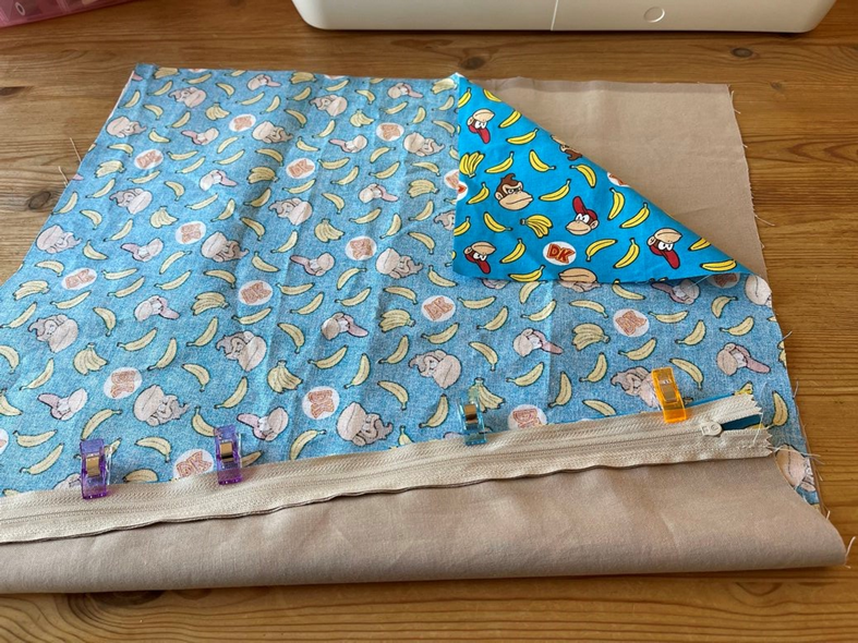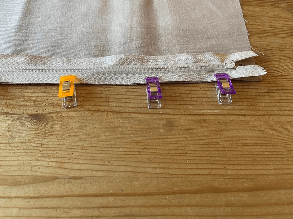Nehmt ein Stoffquadrat und befestigt an einer Seite den Reißverschluss mit Klammern/Stecknadeln, bzw. mit einer Naht.