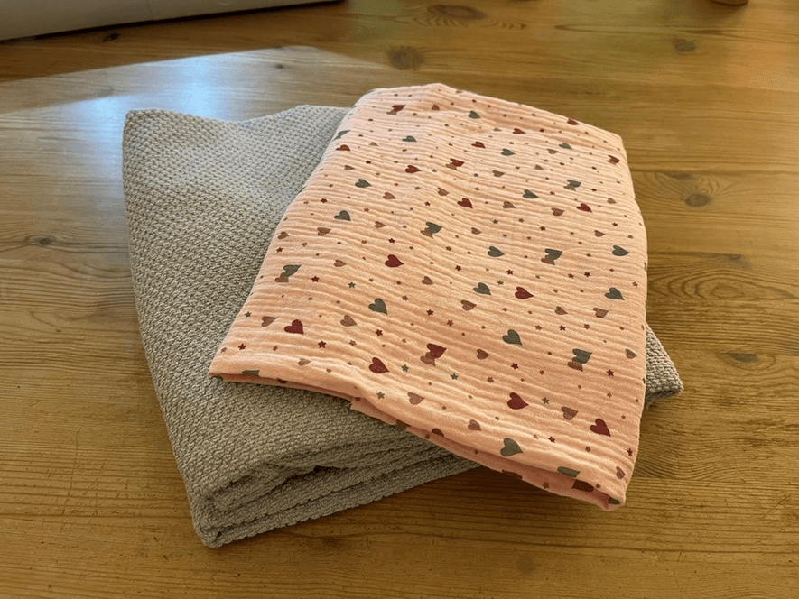 Ihr benötigt zwei gleichgroße Stoffstücke. Rechnet eine Nahtzugabe von 0,5 bis 1 cm dazu. Bügelt die Stoffstücke schön glatt.