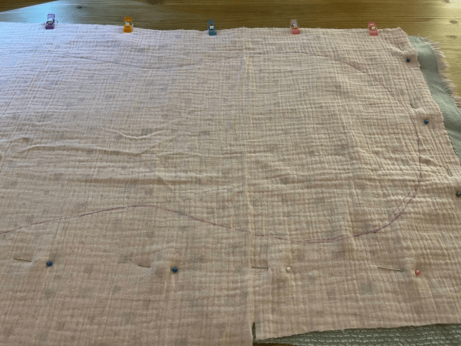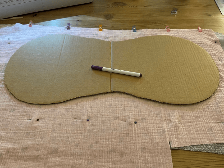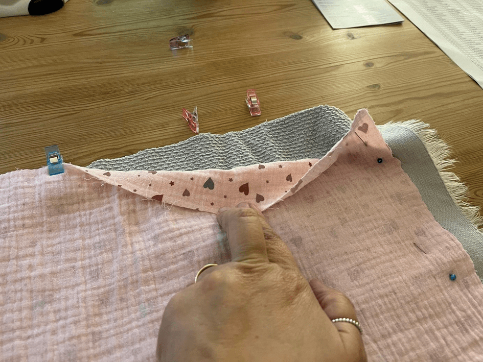 Nehmt die Stoffstücke und legt sie rechts auf rechts (schönen Seiten), genau an den Ecken und Kanten aufeinander. Stellt mithilfe von Klammern oder Nadeln sicher, dass der Stoff nicht verrutschen kann.