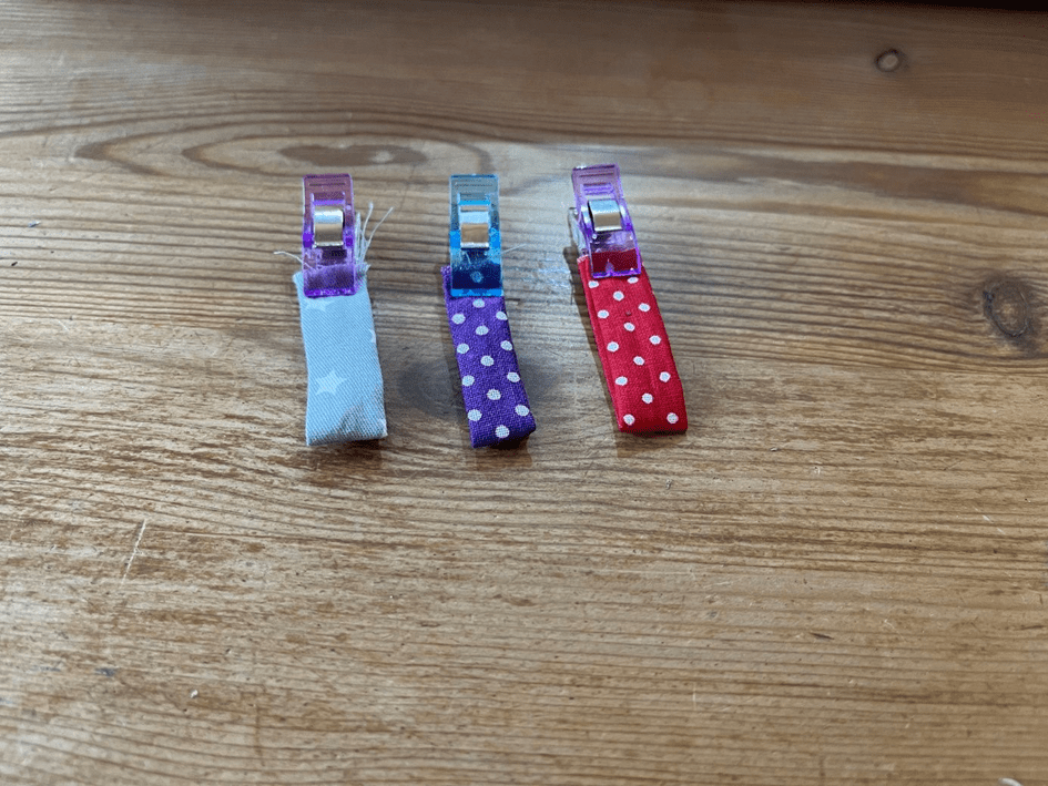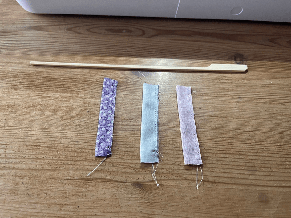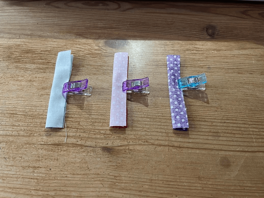 Klammert und näht die Stoffstreifen zusammen. Mit Hilfe des Schaschlickspießes wendet diese – etwas knifflig – und bügelt diese flach. Legt sie dann einmal in der Mitte zusammen und erst einmal zur Seite.
