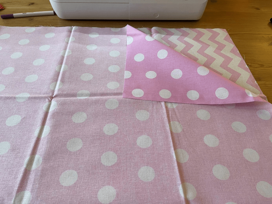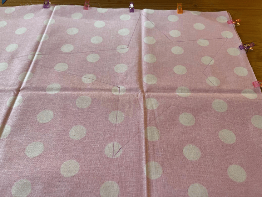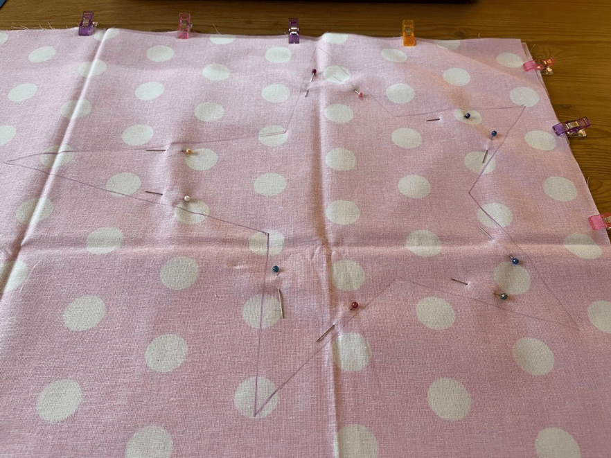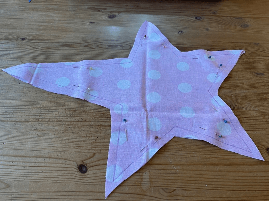 Nehmt zwei Stoffe und legt diese rechts auf rechts (schöne Seiten aufeinander) und fixiert diese. Übertragt nun den Stern auf den Stoff und schneidet diesen mit einer guten Nahtzugabe aus.