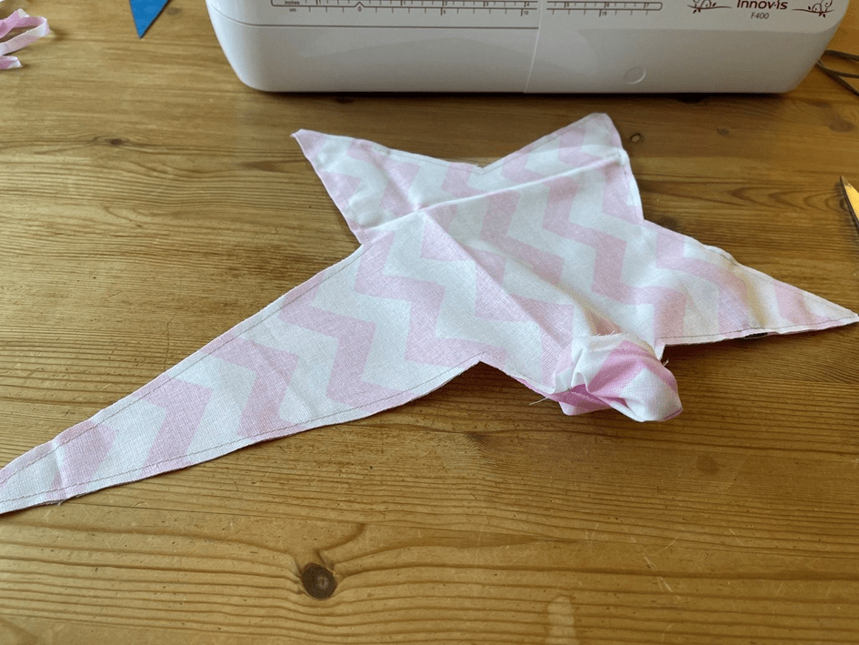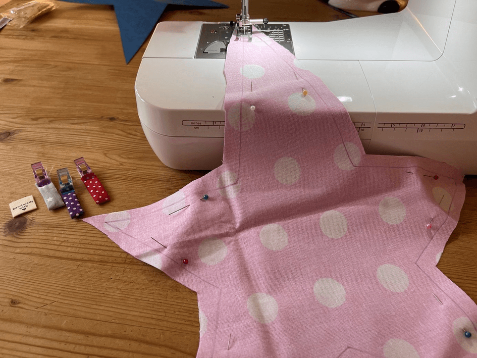 Bevor ihr diesen nun zusammennäht, macht Euch Gedanken zur Gestaltung und an welcher Stelle ihr die vorbereiteten Stoffstreifen anbringen wollt. Fixiert diese an der entsprechenden Stelle und näht dann den Stern entlang Eurer Markierung zusammen. An den Stellen, wo die Stoffstreifen sind, lasst die Nadel ruhig noch ein weiteres Mal drüber laufen, damit sie auch wirklich fest sind.
